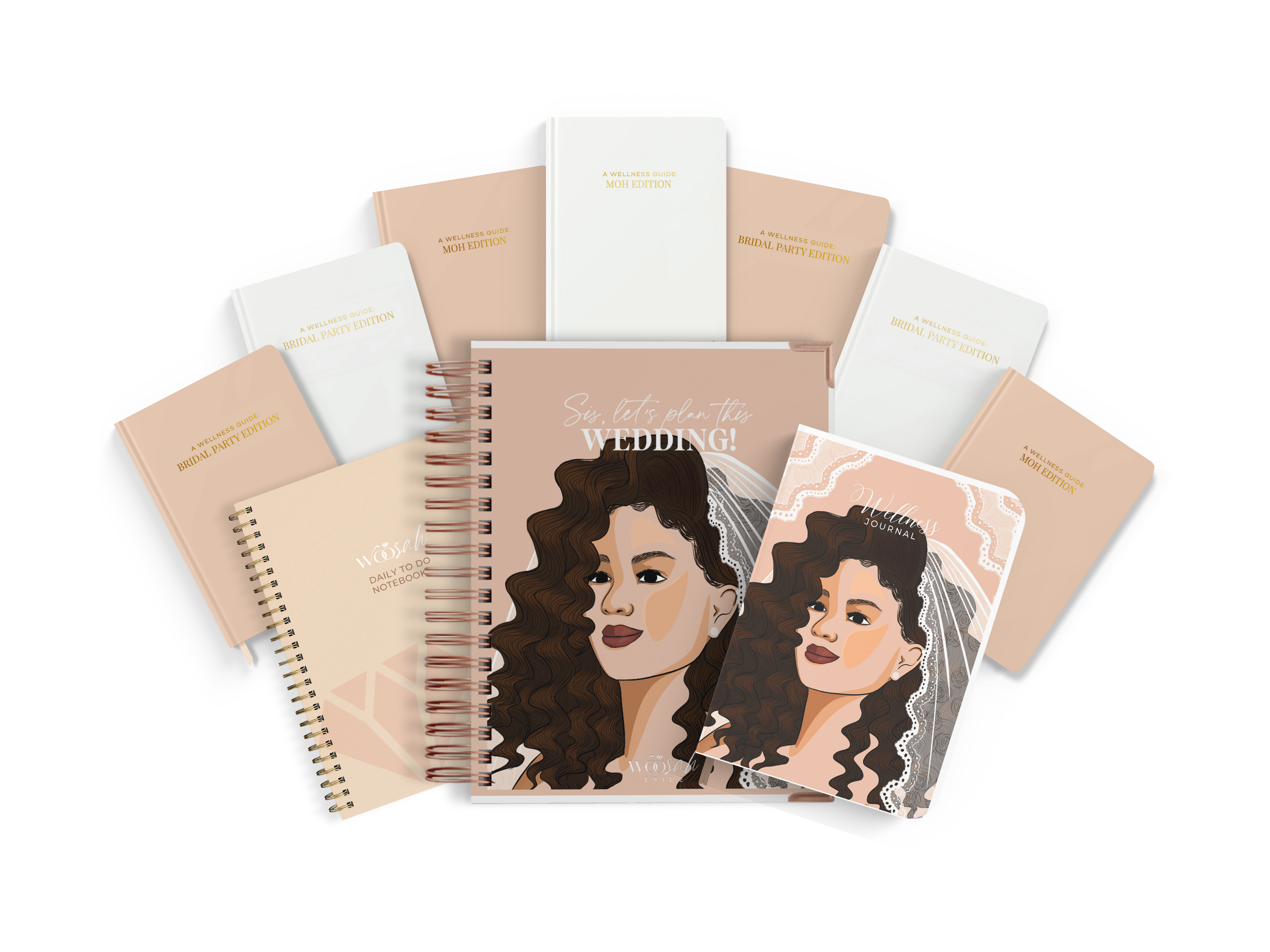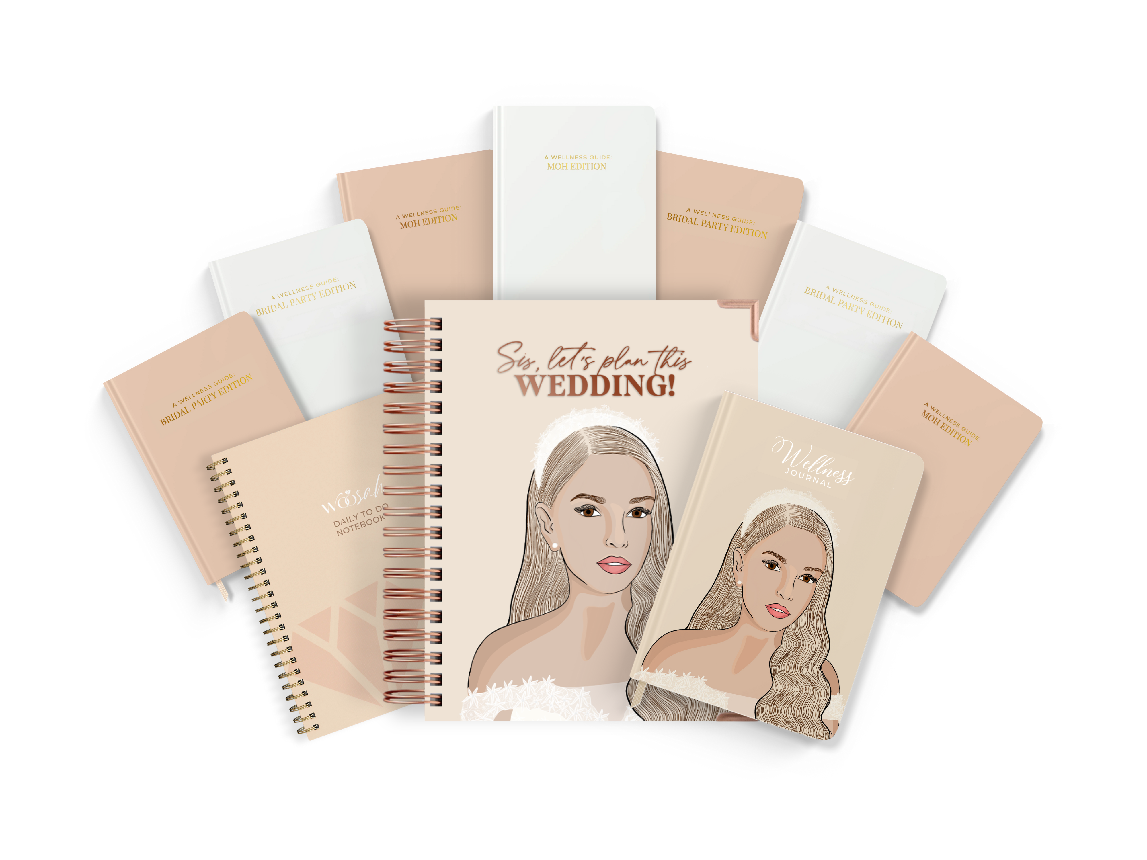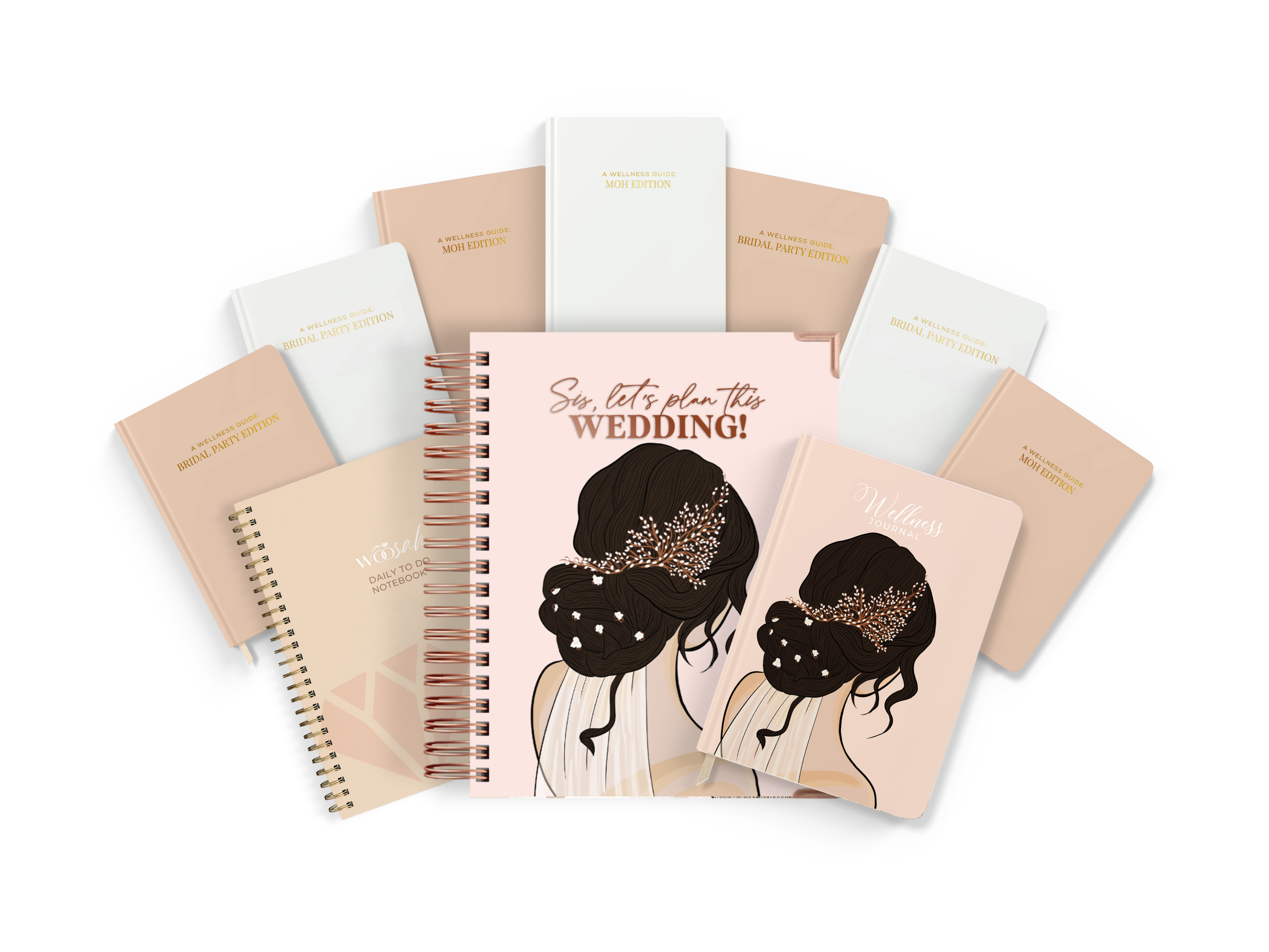 - Up to Seven (7) MOH and Bridal Party Wellness Guides with handmade customizations (mix and match MOH, BRIDAL PARTY and colors for total up to 7)