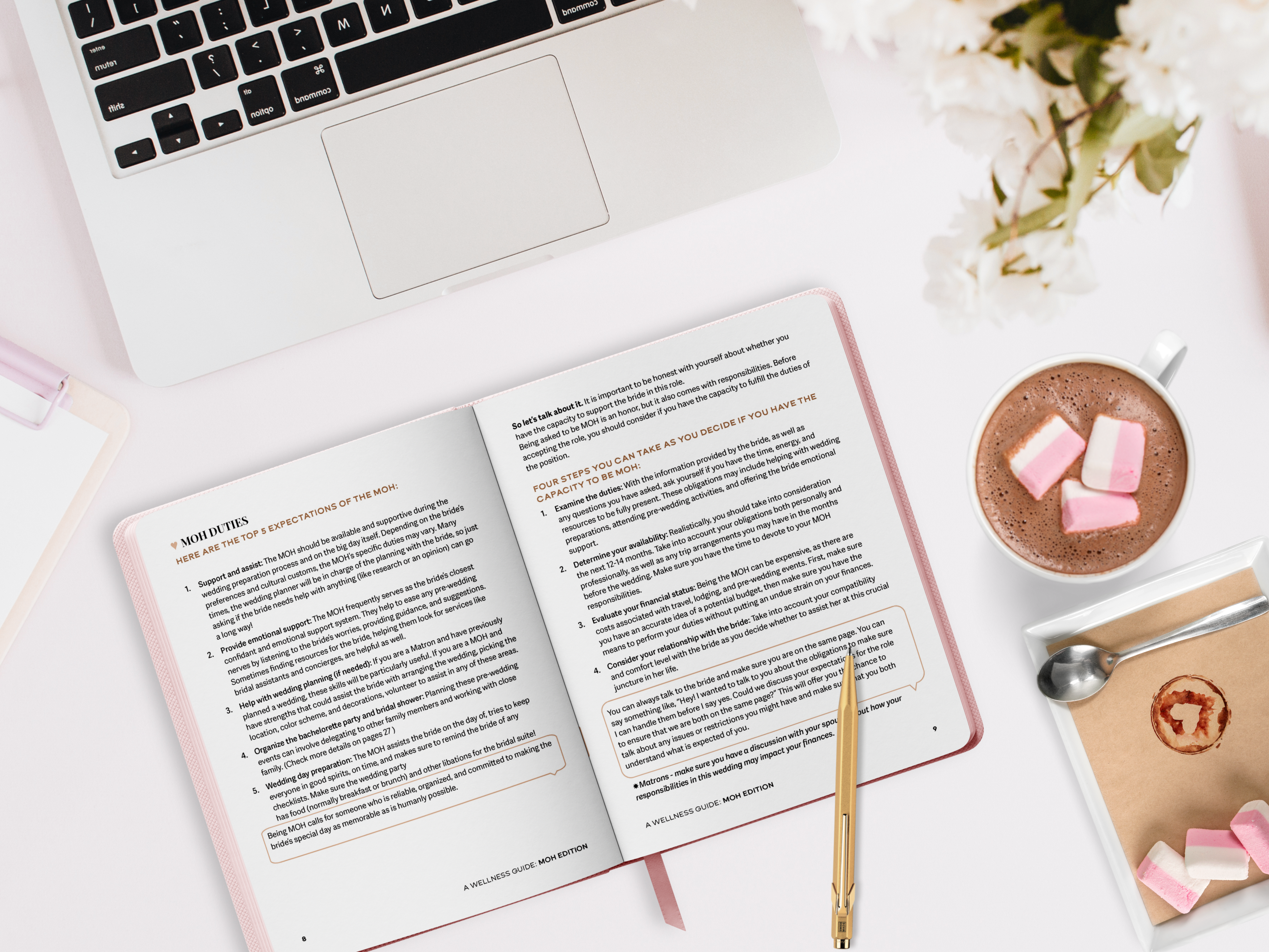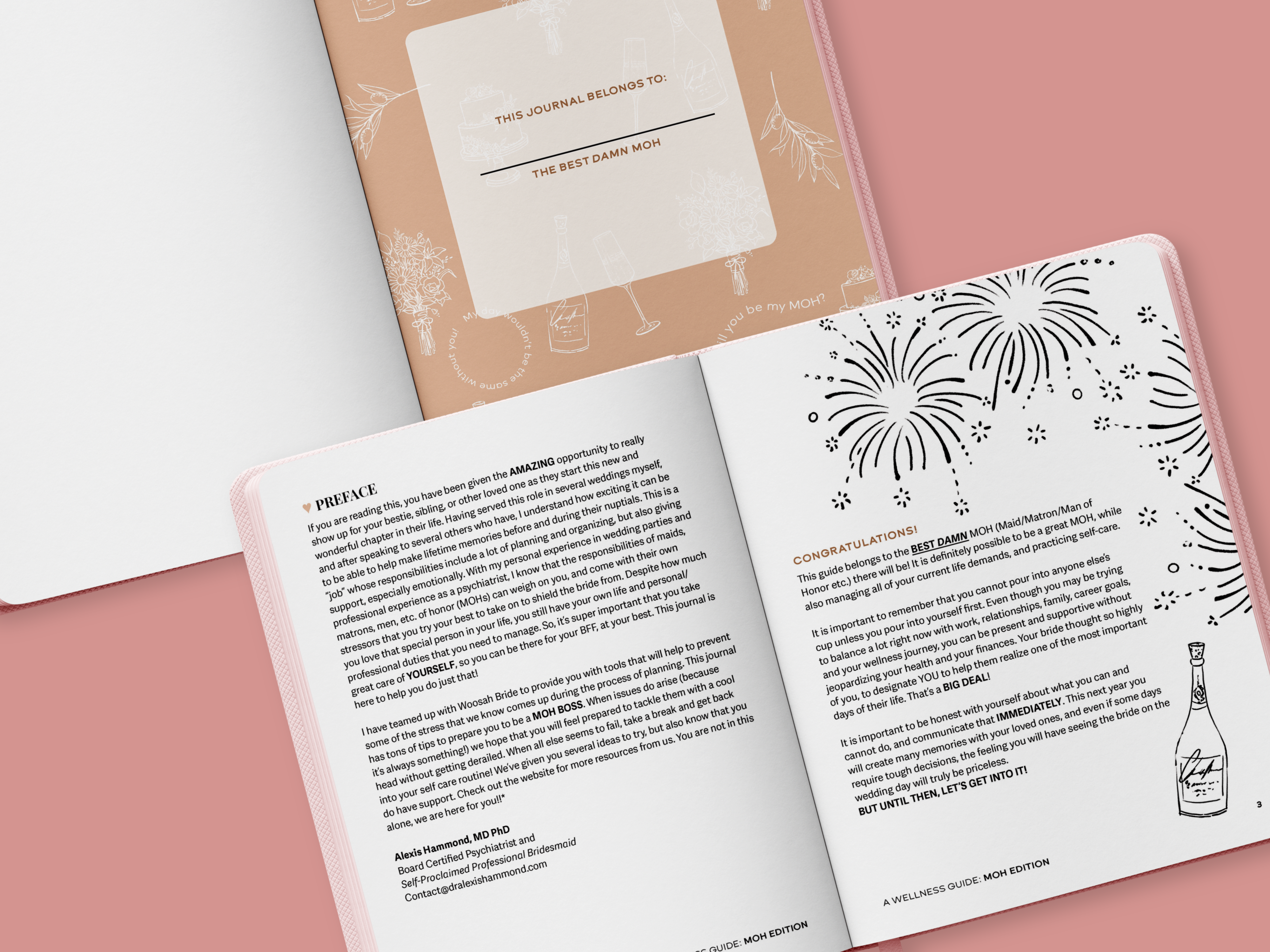 This is the First and Only wellness guide created just for your MOH. Have you ever wondered what it would be like to propose to your bridal party and provide them with a journal that not only provides support as it pertains to what to expect, but also provides curated advice from a psychiatrist to encourage self-care, boundaries, and maintaining your health and wellness in all ways, while supporting a loved one as they plan their wedding? Whew!