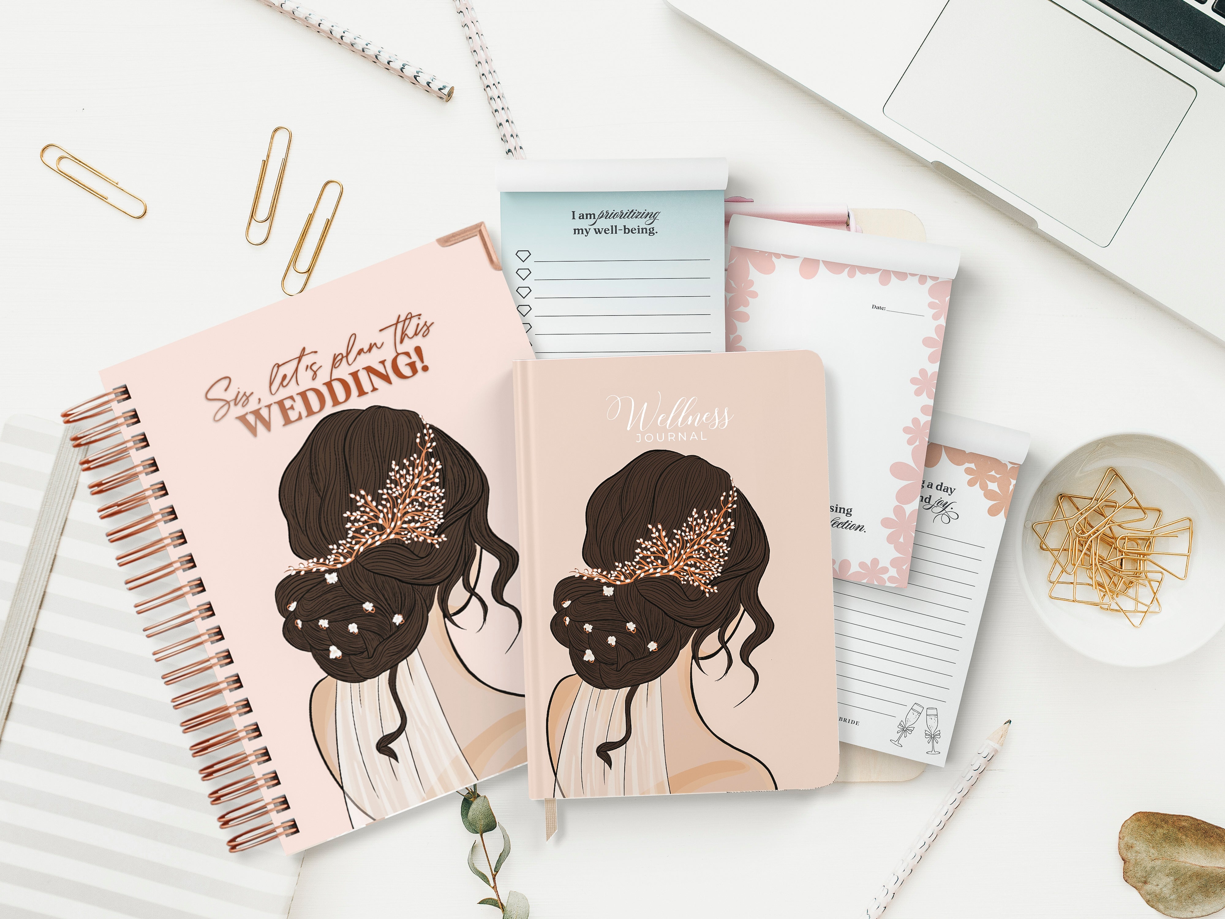 Bridging the gap between wedding planning and self-care w/psychiatrist approved prompts for tracking healthy habits.