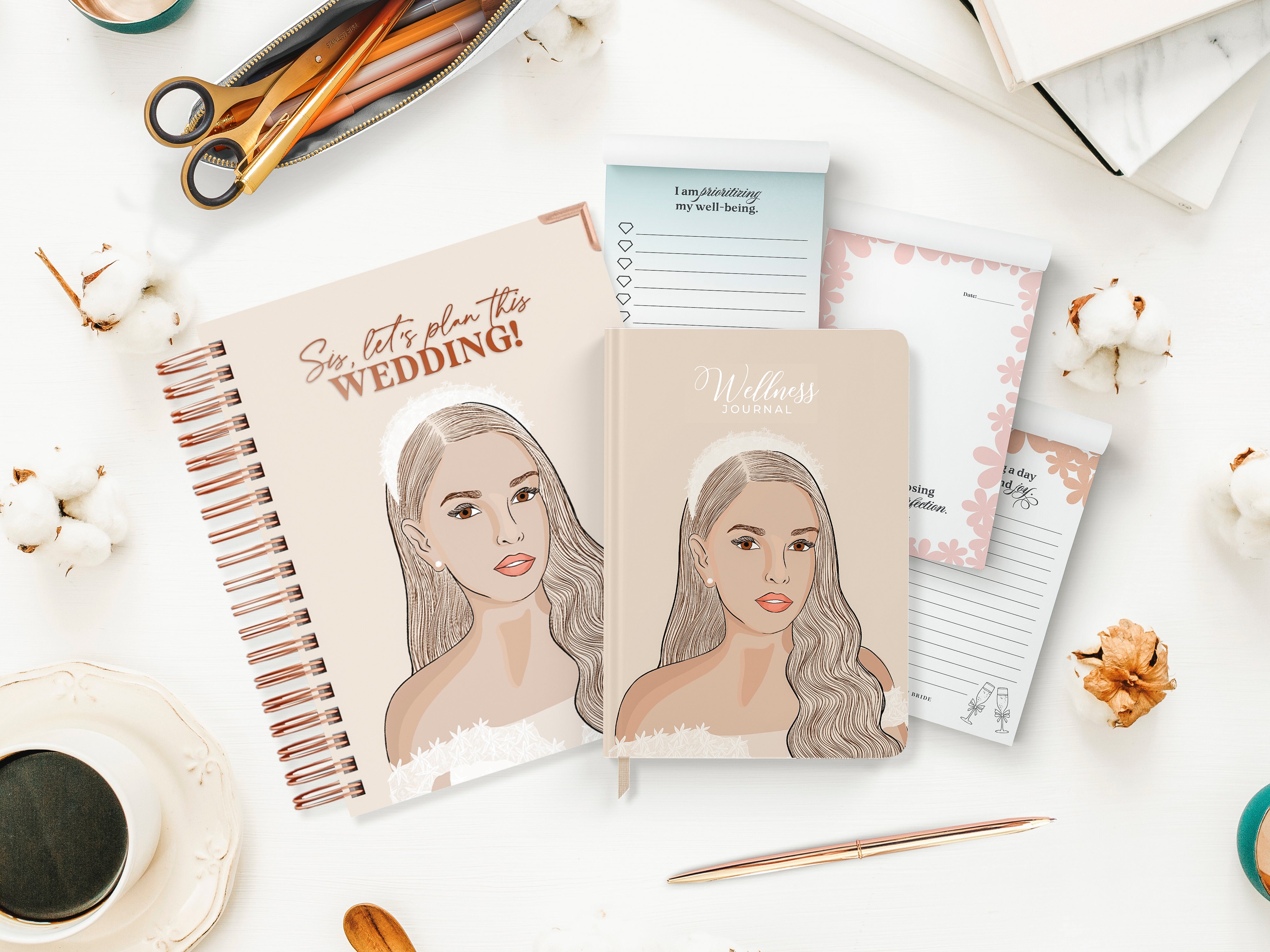 Bridging the gap between wedding planning and self-care w/psychiatrist approved prompts for tracking healthy habits.